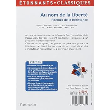 Excellent petit ouvrage pour qui cherche les grands classiques de la poésie de la Résistance : Liberté, La rose et le réséda, La chant des partisans, Je trahirai demain... Chaque poème est introduit avec une notice biographique sur l'auteur, et les circonstances de parution du poème durant la guerre. Tout dans cet ouvrage est à la fois concis, efficace, et riche d'exploitations possibles : documents iconographiques (l'Affiche rouge, mais pas seulement), textes complémentaires (sur les thèmes de la poésie contre la barbarie, la controverse sur la poésie engagée, les détournements et parodies de la poésie clandestine...).La clarté de cet ouvrage le rend tout à fait accessible à des collégiens ; cependant, l'introduction générale, qui dégage les enjeux de la poésie engagée de façon concise mais documentée, permet d'utiliser l'ouvrage jusqu'au lycée.En résumé, un bijou pédagogique, mais aussi une pépite pour compléter sa culture générale.